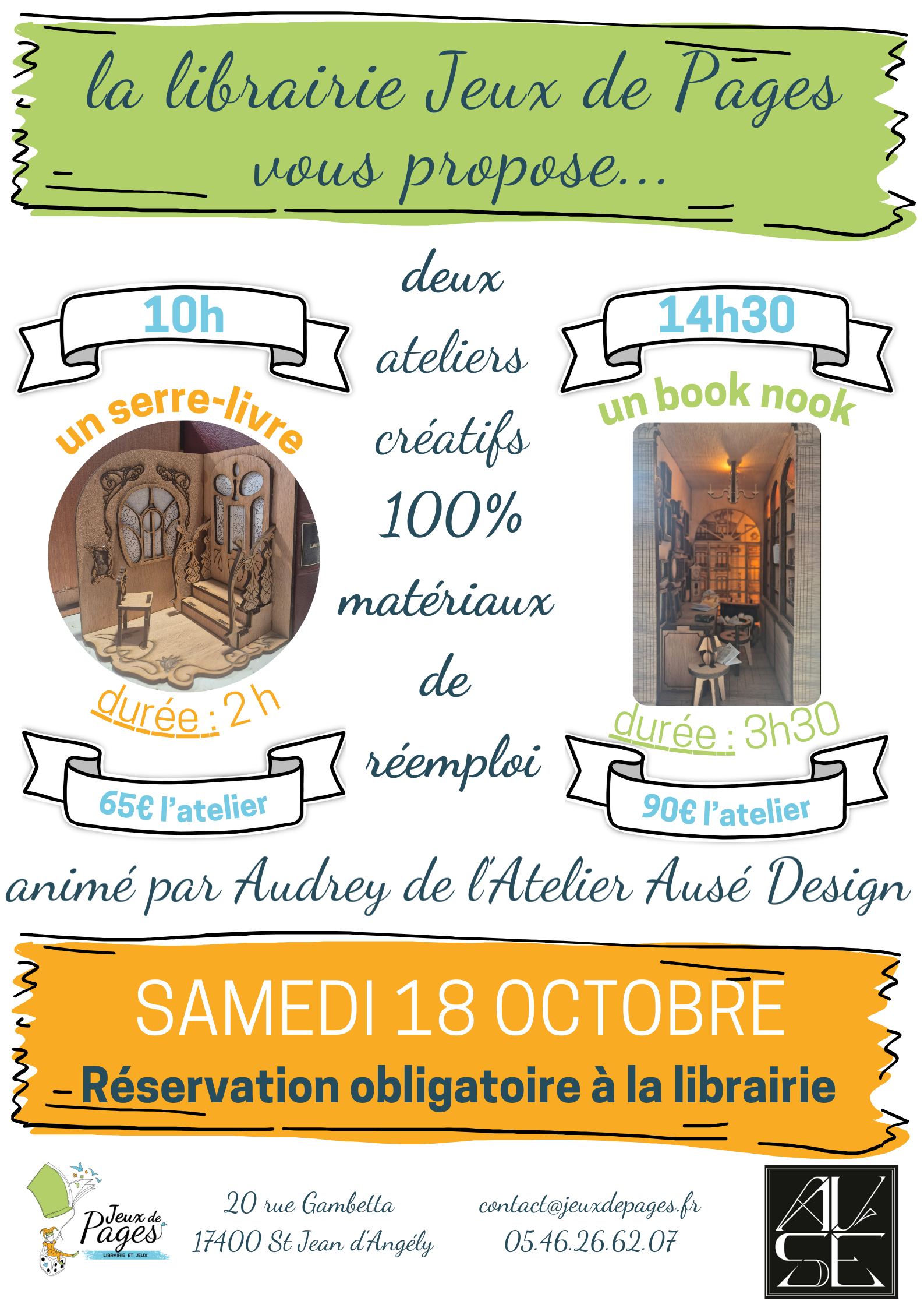 2025La librairie Jeux de Pages vous propose deux ateliers créatifs 100% matériaux de réemploi. 10h-12h : un serre-livre (65€) 14h30-18h : un book-node (90€) Réservation et renseignement : 05 46 26 62 07 ou contact@jeuxdepages.fr