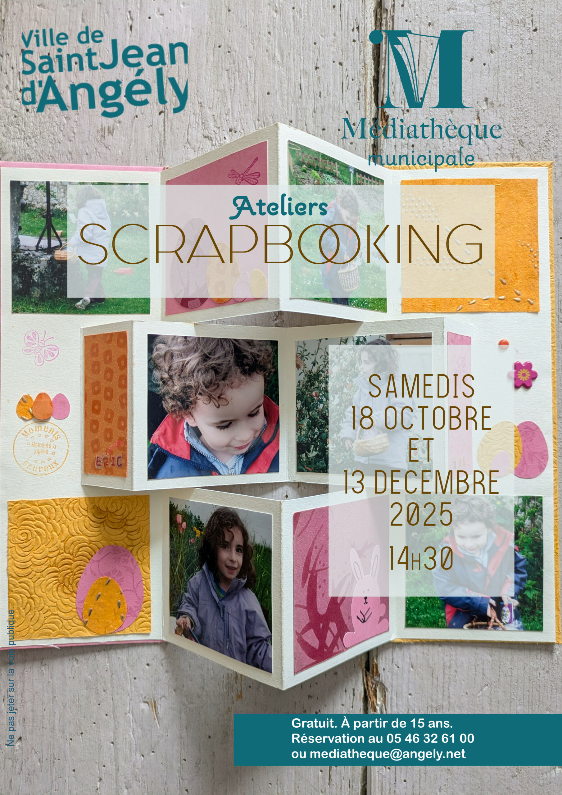 2025Atelier scrapbooking Gratuit à partir de 14h30 Ouvert à tous à partir de 15 ans, sur réservation au 05 46 32 61 00 ou mediatheque@angely.net