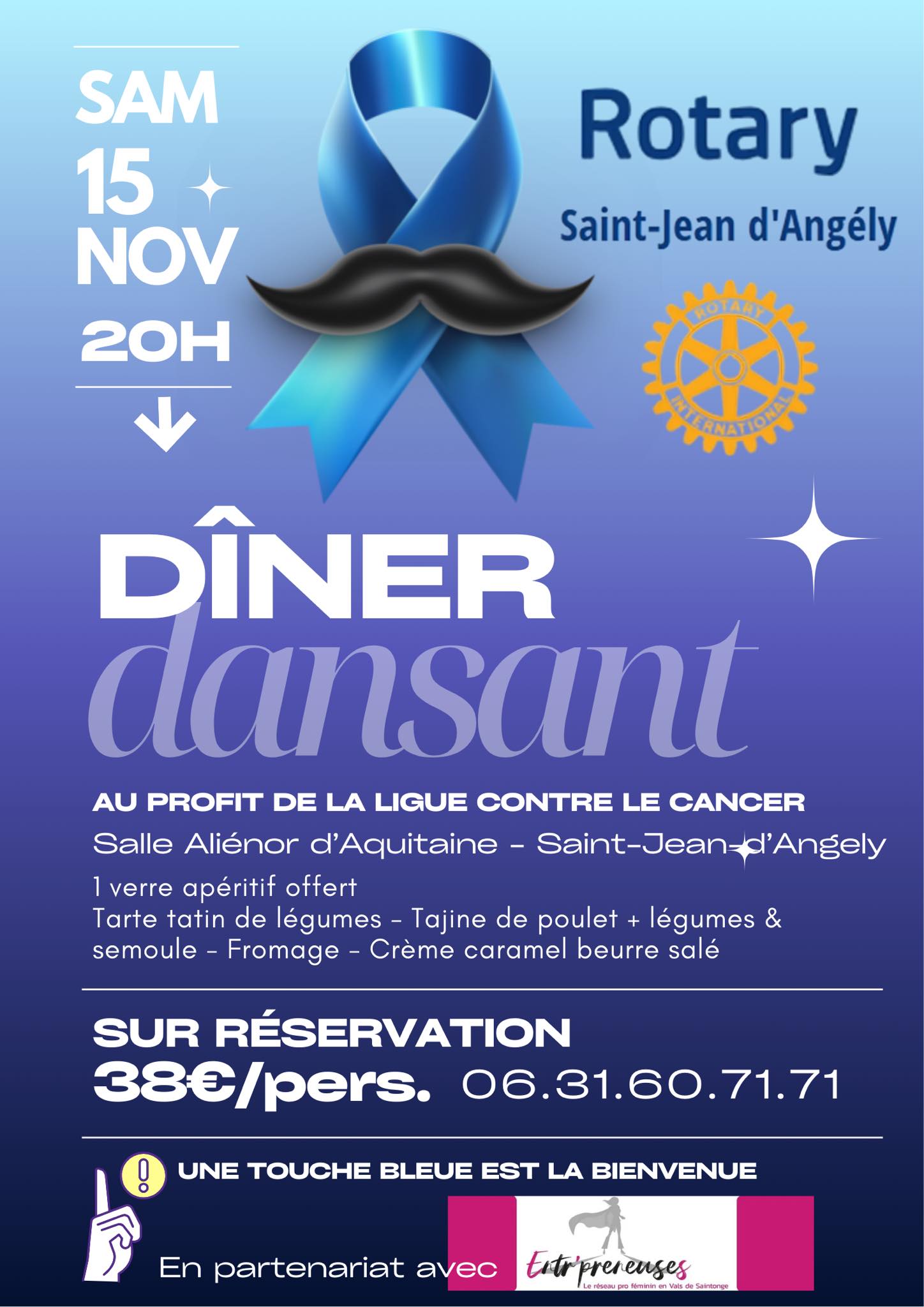 2025En savoir +Dîner dansant animé par DJ DEV au profit de la la Ligue contre le cancer. Organisé par le Rotary de Saint-Jean-d’Angély en partenariat avec les Entrepreneuses. 20h 38€/personne Sur réservation : 06 31 60 71 71