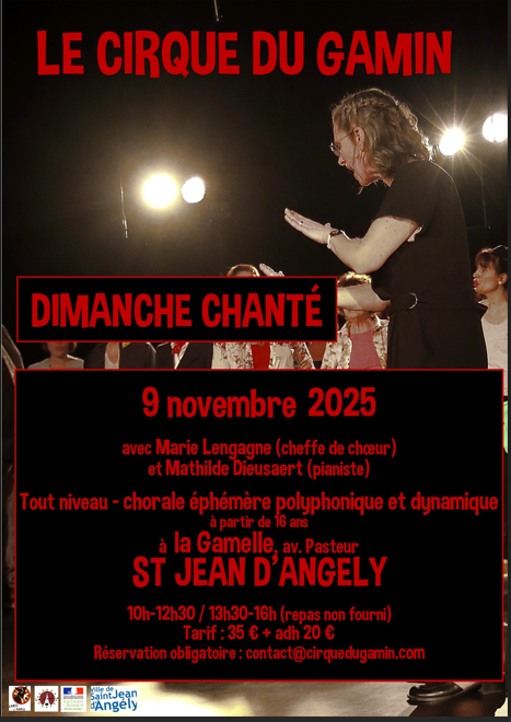 2025En savoir +Chorale éphémère, polyphonique et dynamique. À partir de 16 ans. Avec Marie Lengagne (cheffe de chœur) et Mathilde Dieusaert (pianiste) 10h-12h30/13h30-16h Tarif : 35€ réservation obligatoire : contact@cirquedugamin.com