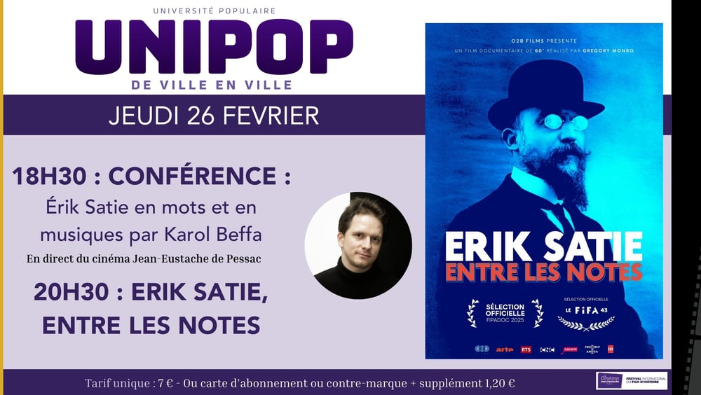 2026En savoir +18h30 : conférence en direct du cinéma Jean-Eustache de Pessac 20h30 : Erik Satie, entre les notes 7€ ou carte d’abonnement