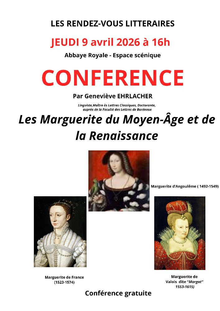 2026En savoir +Conférence sur « Les Marguerite de la Renaissance ». de 16h à 18h. Espace scénique de l’Abbaye royale. Pour adultes Gratuit Renseignements au 06 86 64 53 37