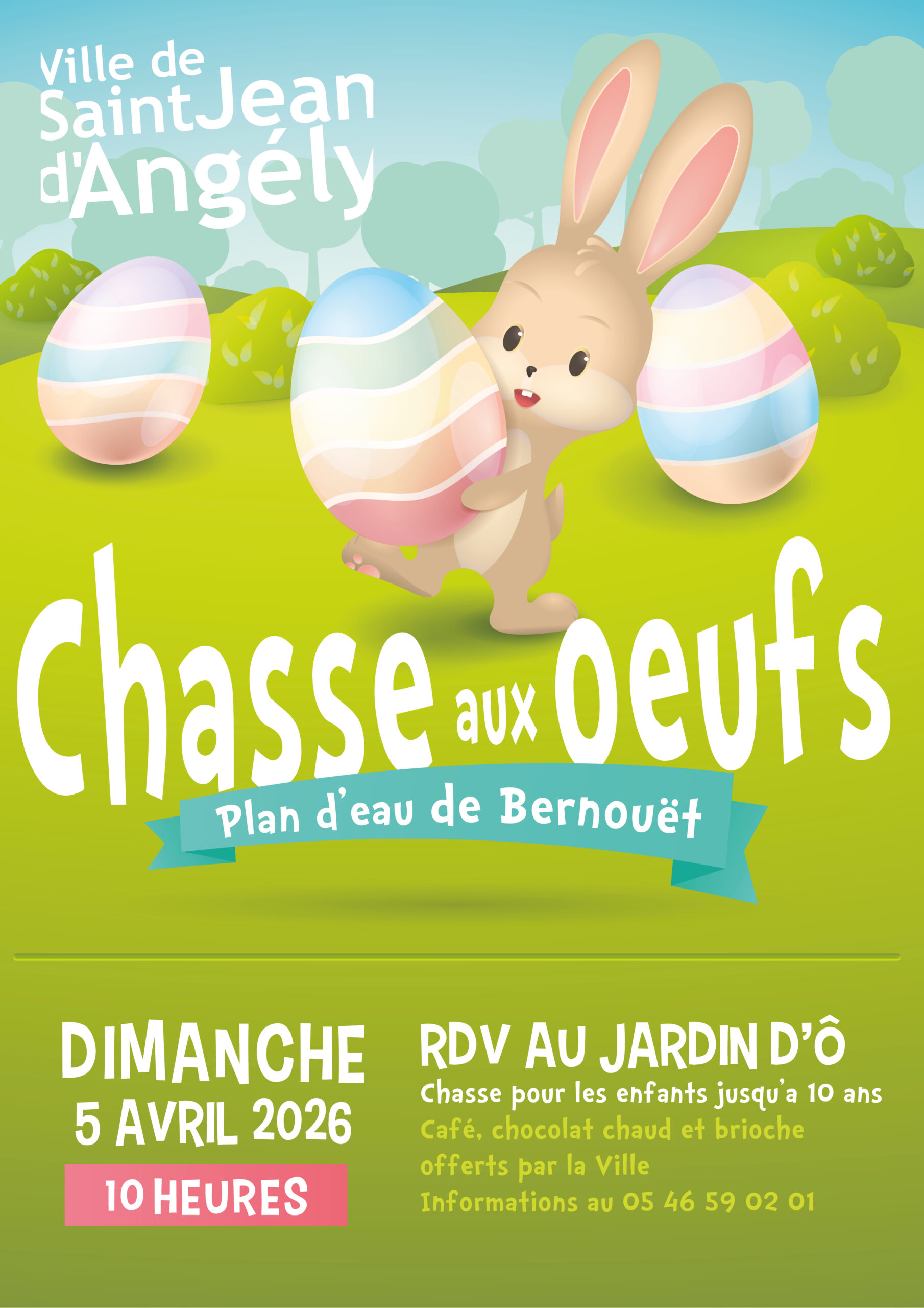 2026En savoir +Chasse aux oeufs Dimanche 5 avril 2026 Plan d’eau de Bernouët Gratuit RDV au Jardin d’ô pour la chasse aux œufs (enfants jusqu’à 10 ans) à 10 heures. Café, chocolat chaud et brioche offerts par la Ville. Informations au 05 46 59 02 01