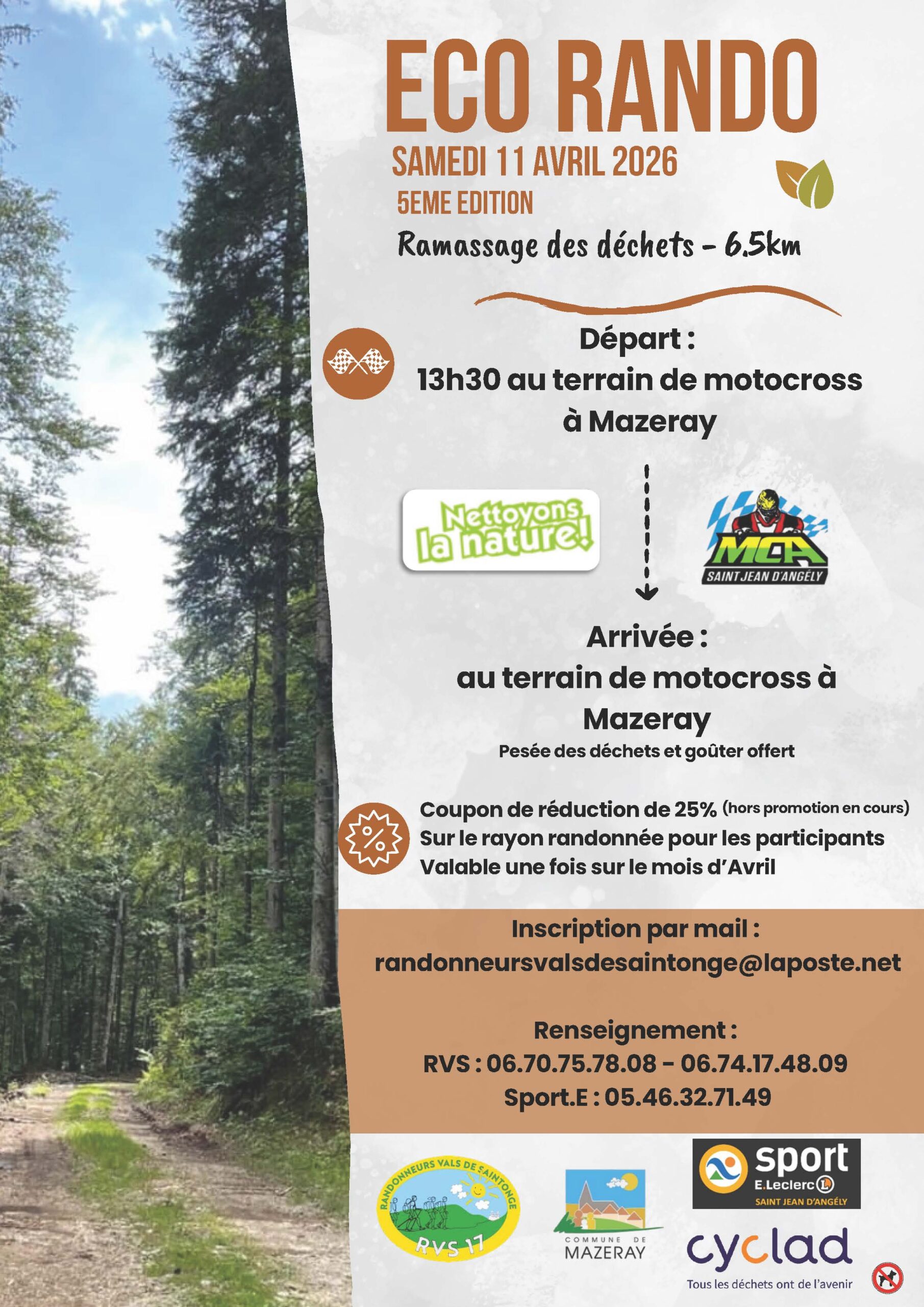 2026En savoir +6,5 kms | Ramassage des déchets |Départ 13h30 au terrain de motocross à Mazeray Inscription par mail : randonneursvalsdesaintonge@laposte.net Renseignements : 06 70 75 78 08