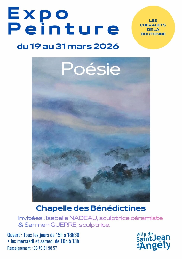 2026En savoir +Exposition des Chevalets de la Boutonne avec comme invitées Isabelle Nadeau, sculptrice céramiste et Sarmen Guerre, sculptrice. Ouvert tous les jours de 15h à 18h30 et les mercredi et samedi de 10h à 13h Renseignements : 06 79 31 98 57