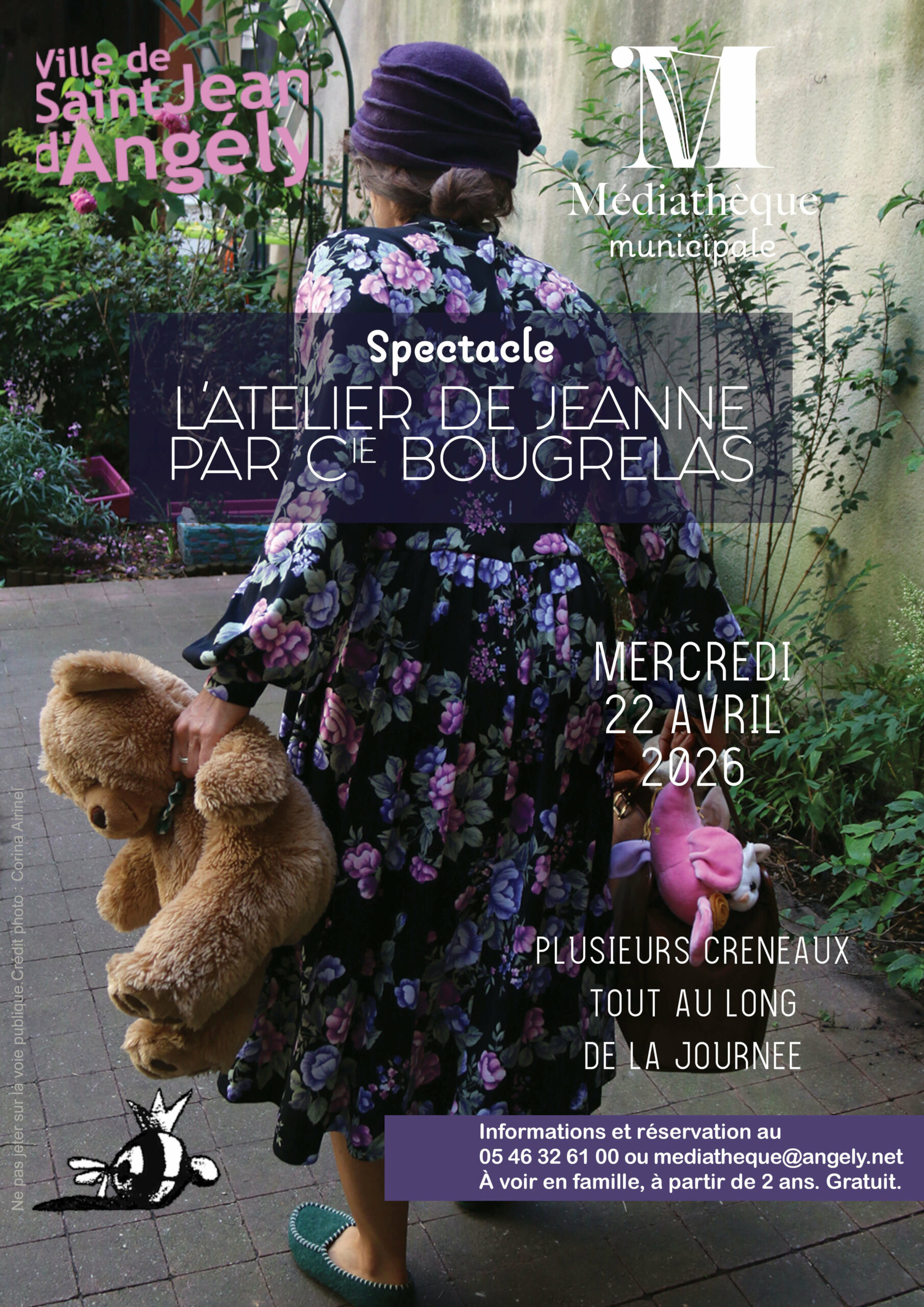 2026En savoir +À partir de 2 ans. Gratuit. 10h, 10h20, 10h40, 11h, 11h20, 14h30, 14h50, 15h10, 15h30, 15h50 | Durée : 20 min. Sur réservation : 05 46 32 61 00 ou mediatheque@angely.net https://www.compagniebougrelas.com/en-tournee/l-atelier-de-jeanne/