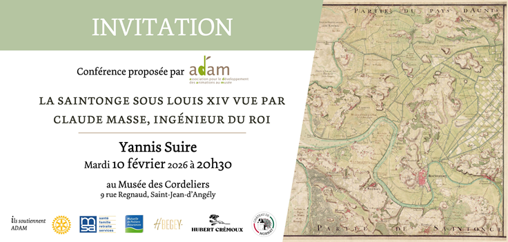 2026En savoir +La Saintonge sous Louis XIV vue par Claude Masse, ingénieur du roi. Conférence de Yannis Suire, proposée par Adam. 20h30 Participation libre Réservation recommandée au 05 46 25 09 72