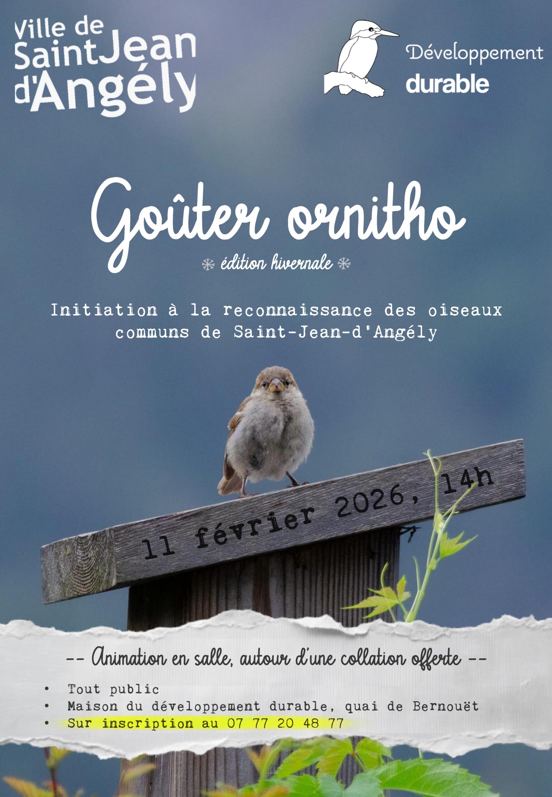 2026En savoir +Initiation à la reconnaissance des oiseaux communs à Saint-Jean d’Angély. 14h-16h30 Sur inscription au 07 77 20 48 77 ou emmanuelle.lussier@angely.net Animation en salle autour d’une collation offerte.