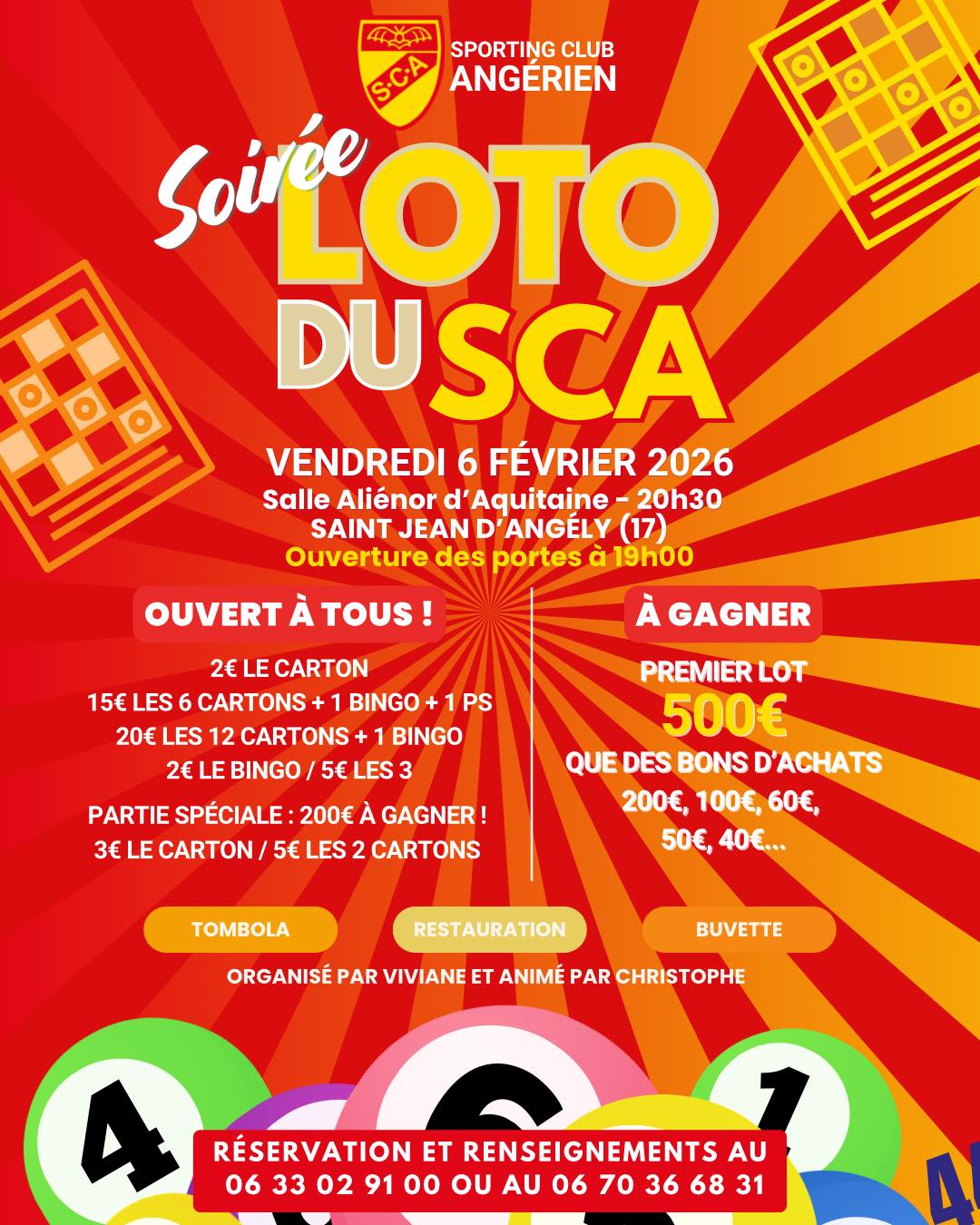 2026En savoir +Grand loto, un moment convivial à partager entre amis ou en famille. Ouverture des portes à 19h Renseignements : https://www.facebook.com/SportingClubAngerien/photos/-vie-du-clubenvie-de-passer-une-super-soir%C3%A9e-et-de-tenter-votre-chance-le-sporti/1546371686530584/ 06 70 36 68 31 ou 06 33 02 91 00