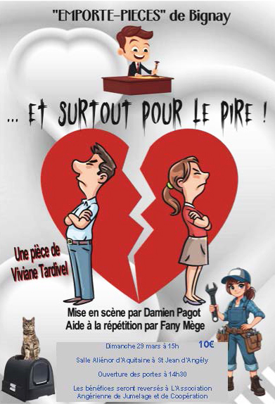 2026En savoir +Par la Compagnie « Emporte-pièce » de Bignay 15h (ouverture des portes à 14h30). Tarif : 10€ Bénéfices reversés à l’Association Angérienne de Jumelage et de Coopération