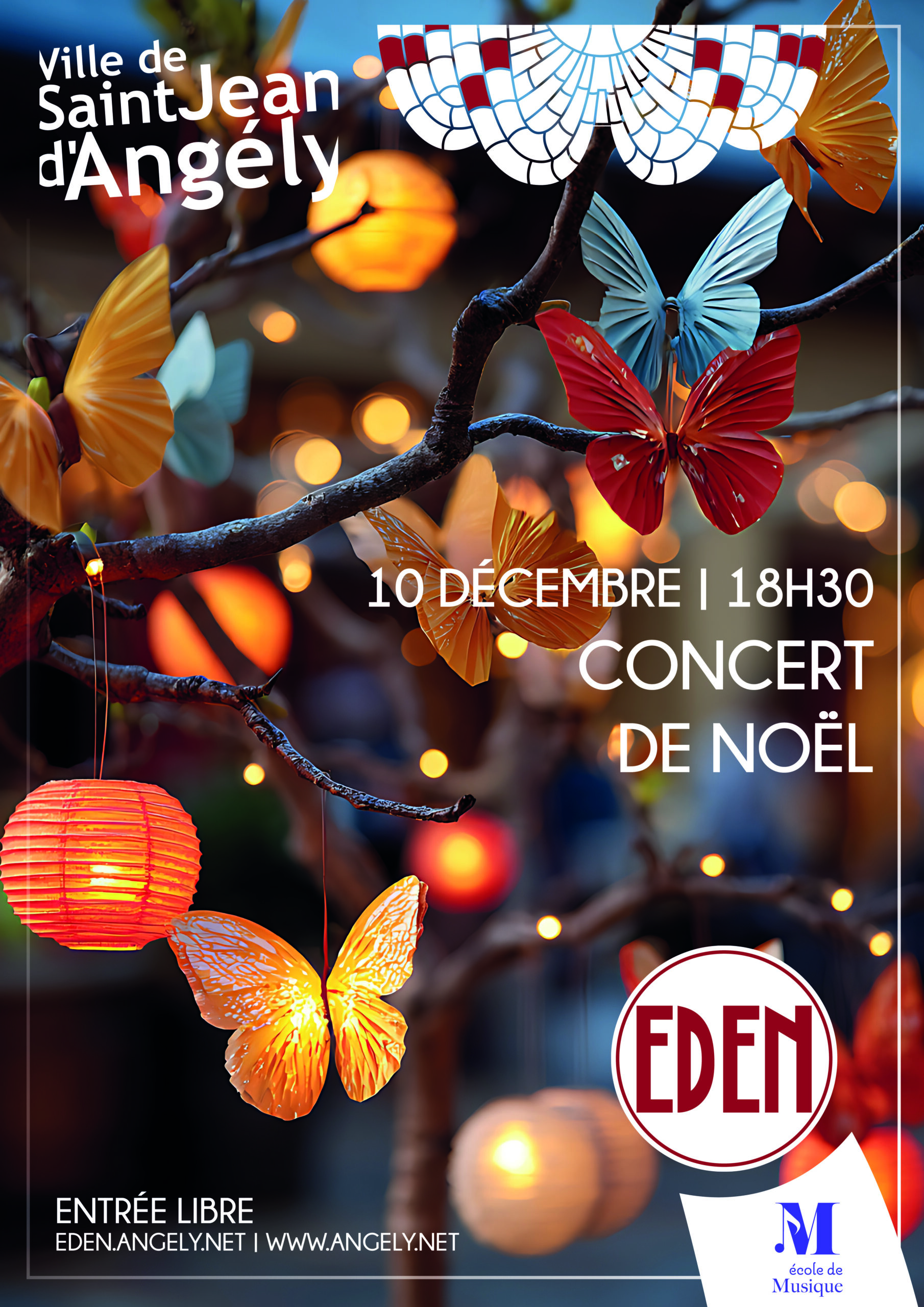 2025En savoir +Concert de Noël de l’École Municipale de Musique, préparé par les ensembles de classes instrumentales et l’orchestre de l’école. Renseignements au 05 46 32 27 70 ou par mail : ecole.musique@angely.net Entrée libre 18h30-20h