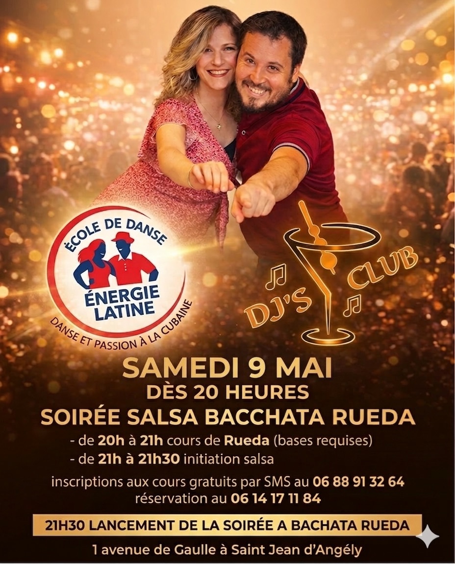 2026En savoir +20h-21h : cours de rueda | 21h-21h30 : initiation salsa | 21h30 : lancement de la soirée | réservation : 06 14 17 11 84 | inscription gratuite aux cours par SMS : 06 88 91 32 64